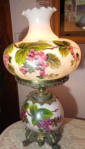 LOT 13 - Vintage Hand-Painted Hurricane Lamp with a Grape Leaf Design 27" Tall
