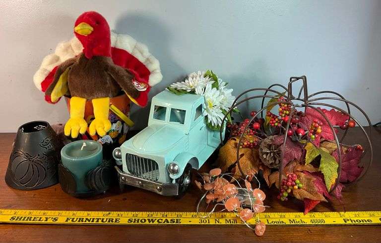 LOT 606 - Metal Truck, Thanksgiving Centerpiece, Ty Beanies Turkey & Lobster, Candle with Holder & Pumpkin Lig
