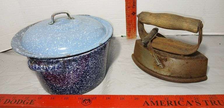 LOT 422 - Sad Iron and Enamel Pot