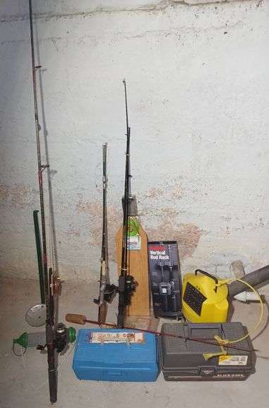 LOT 431 - Fishing Supplies, Rod and Reels, Minnow Bucket, Fish Scaling Board, Two Tackle Boxes with Contents