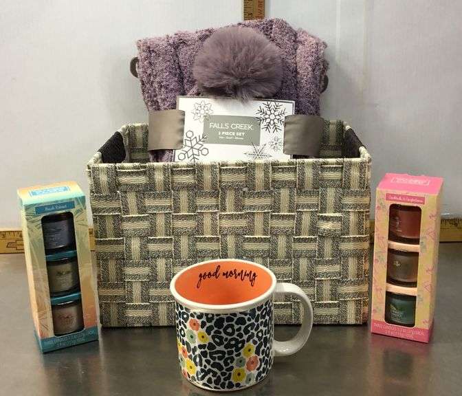 LOT 255 - 3 Piece Winter Set, 2-3 Piece Yankee Candle Sets, Cloth Basket and Coffee Mug