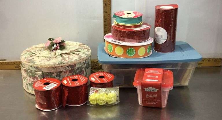 LOT 98 - Sewing Box, Ribbon, Plastic Containers and Stampers