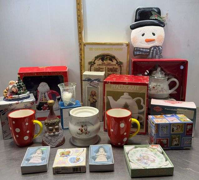 LOT 205 - Decorative Christmas Decor, Cups, and Tea Pots