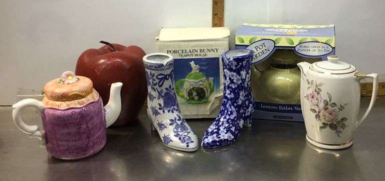 LOT 230 - Decorative Boot Vases, Large Wax Apple and Tea Pots