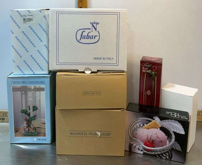 LOT 336 - Bunny Figures & Candle Holders, Chirping Bird Plate, Magnolia Night Light, Rose, Bud Vase & Apple Bo