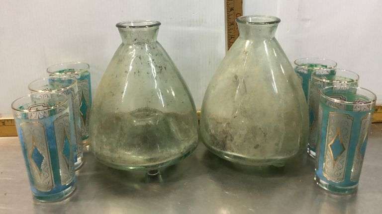 LOT 181 - 2 Very Heavy Bottom Glass Jars & a Set of 6 Decorative Drinking Glasses