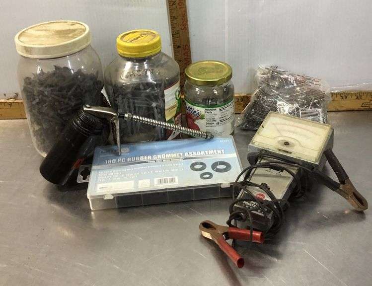 LOT 185 - Nails, Grommets, Oil Can, Tach Tester & Nuts & Bolts