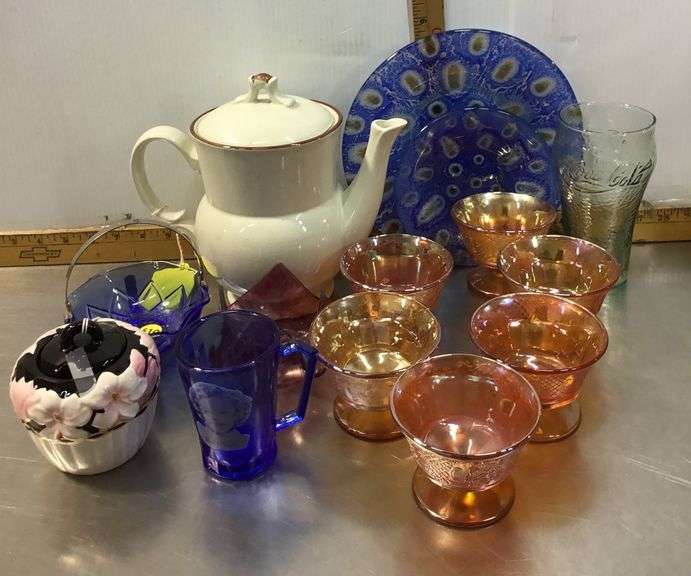 LOT 277 - Carnival Glass, Shirley Temple Cup, Tea Pot, Decorative Plates & More