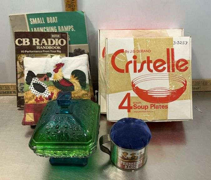 LOT 301 - Crstelle Dishes in Boxes, Decorative Glass, Tin Cup Pin Cushion, Hot Pads & CB Radio & Boat Booklets