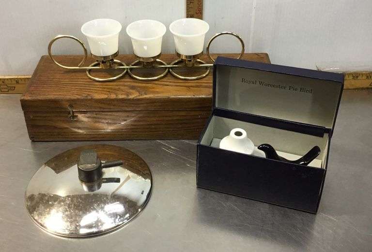 LOT 357 - Royal Worcester Pie Bird, Wooden Tool Box, Candle Holder and ACME Swing Bracket