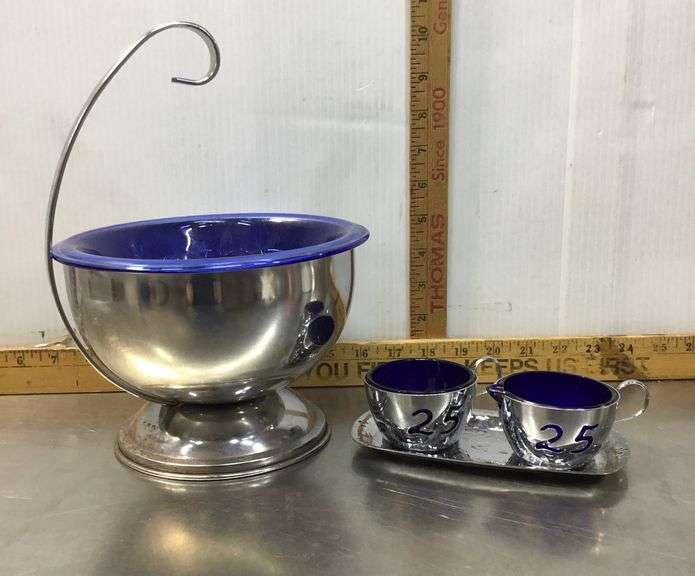 LOT 130 - Vintage Hazel Atlas Chrome Ice Bucket With Cobalt Insert and 25th Anniversary Cream & Sugar Set