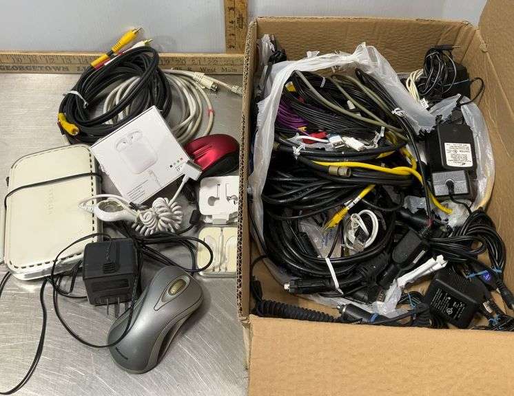 LOT 190 - Box of Electronics, Cords, Earphones, Mouse, Router & More