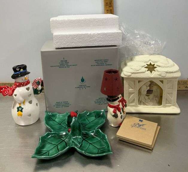 LOT 254 - Party Lite Manger Scene, Snowmen Candle Holders, Ornaments & Candy Dish