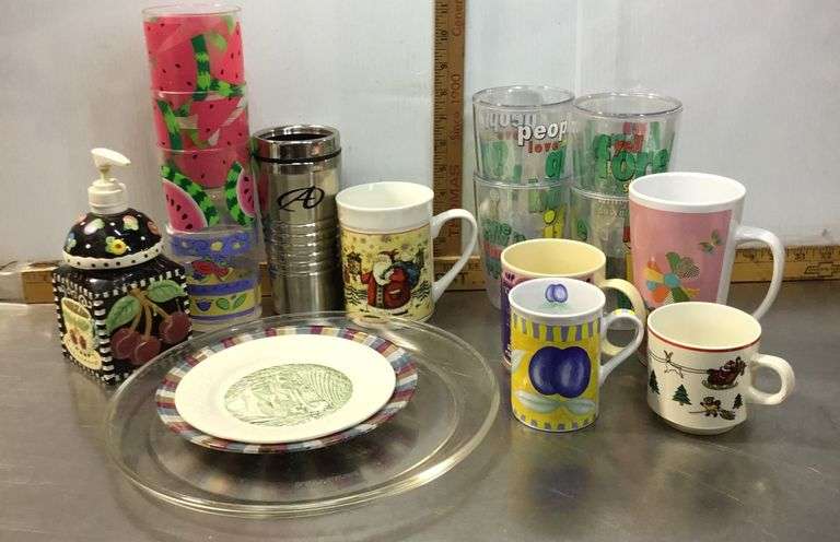 LOT 309 - Mugs, Glasses, Platter, Soap Dispenser and Plates