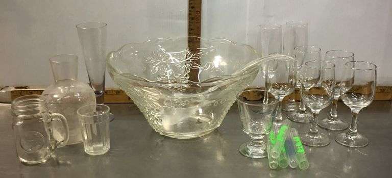 LOT 320 - Punch Bowl, Stemware, Shot Tubes, Decanter, Ladle and Glasses