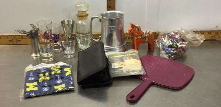LOT 330 - Shot Glasses, Playboy Mug, Michigan Swag, Mirror, Sewing Kit, Poncho and Toys