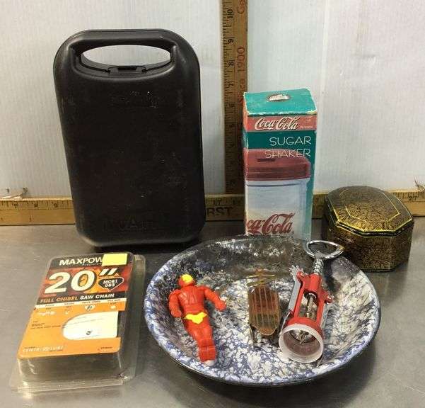 LOT 294 - Wahl Animal Care Trimmers (have power), Enamel Plate, Coca-Cola Sugar Shaker, Trinket Box, Chainsaw