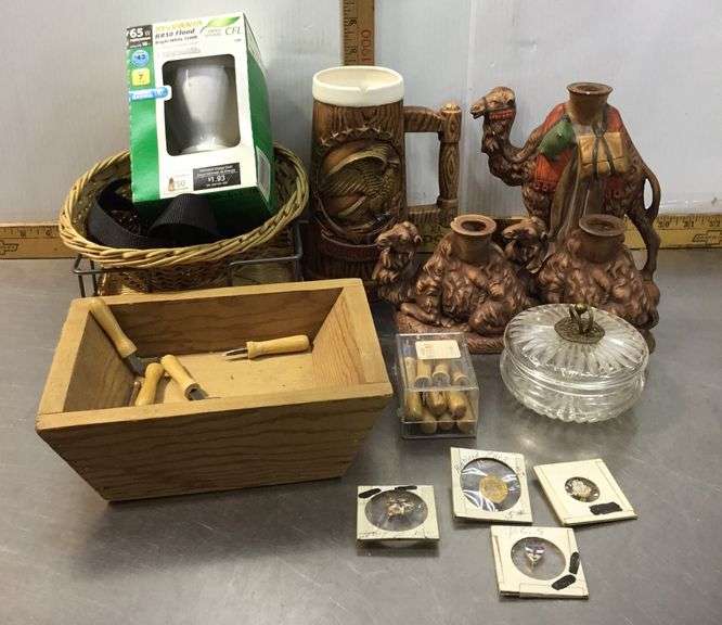 LOT 296 - Camel Candle Holders, Mug, Powder Box, Pins, Snack Forks, Lightbulb and More
