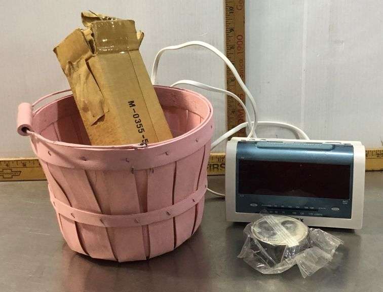 LOT 299 - Timex Alarm Clock (has power), Basket, Hockey Puck and Cookie Press