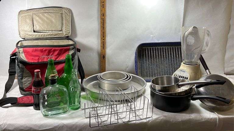 LOT 505 - Artic Zone Cooler, Cake Pans, Old Bottles, Cooking Pans